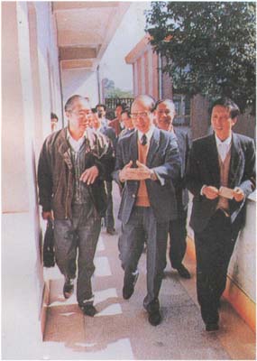 1992年11月,九三學社成員、廣州私立華聯大學校長侯德富(前右一)陪同中共廣東省委書記謝非(前中)視察該校。