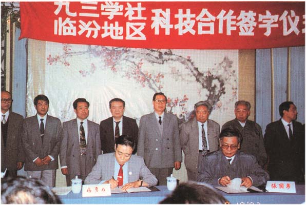 1993年8月,九三學(xué)社與山西臨汾地區(qū)簽訂“九臨科技合作協(xié)議”。徐采棟副主席出席簽字儀式。