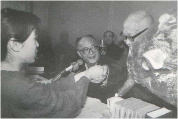 1986年1月20日,首都學術界人士聚集一堂,祝賀中國古典文學研究專家俞平伯(右一)從事學術活動65周年。左二為胡繩。