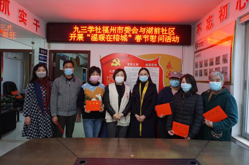 新春佳節將至,為關懷關愛社會弱勢群體,讓社區困難群眾度過一個歡樂祥和的節日,九三學社福州市委持續開展“溫暖在榕城”系列志愿服務活動。2月4日,社市委專職副主委兼秘書長羅楓一行來到鼓樓區五鳳街道湖前社區與社區困難群眾開展座談,了解他們生活情況,向他們發放慰問金,并送上節日的問候和祝福,用愛匯聚成一縷縷陽光,溫暖榕城。