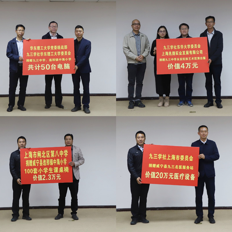 會上還舉辦了捐贈儀式。經社市委聯系協調,華東理工大學黨委統戰部、社華東理工大學委員會向威寧縣九三中學、迤那鎮中海小學捐贈共計50臺電腦;社東華大學委員會、上海兆捷實業發展有限公司捐贈九三中學永安民族藝術團演出服價值4萬元,社員、上海中醫藥大學教授李福鳳聯系捐贈威寧縣九三名醫服務站價值20萬元醫療設備,上海市閘北第八中學向中海小學捐贈價值2.3萬元的100套小學生課桌椅。