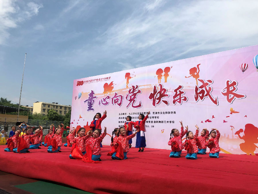 蕪湖市人大常委、九三學(xué)社蕪湖市委副主委、安徽師范大學(xué)教育科學(xué)學(xué)院副教授鄭筱妍致辭,并給孩子們送上節(jié)日祝福。演出的節(jié)目有《繡紅旗》、《精忠報國》等,全部由該校學(xué)生和學(xué)前機構(gòu)學(xué)生表演,表達(dá)了少年兒童們喜迎中國共產(chǎn)黨建黨100周年,從小就愛黨愛祖國,聽黨話感黨恩,展現(xiàn)了少年兒童們充滿陽光、獨立自強的精神面貌。