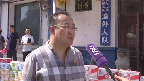 孫慶濤在接受電視臺采訪時表示,感謝全體民警、輔警冒著高溫酷暑,默默的堅守和付出,感謝人民衛士為轄區道路交通持續穩定暢通做出的貢獻。大家要注意防暑降溫,合理安排勤務,做好自身安全防護。為廣大人民群眾創造安全文明、暢通有序的道路交通環境,守護人民群眾的平安出行。作為民主黨派成員也應盡一份社會責任,夏日酷暑里為他們送去一片‘清涼’。