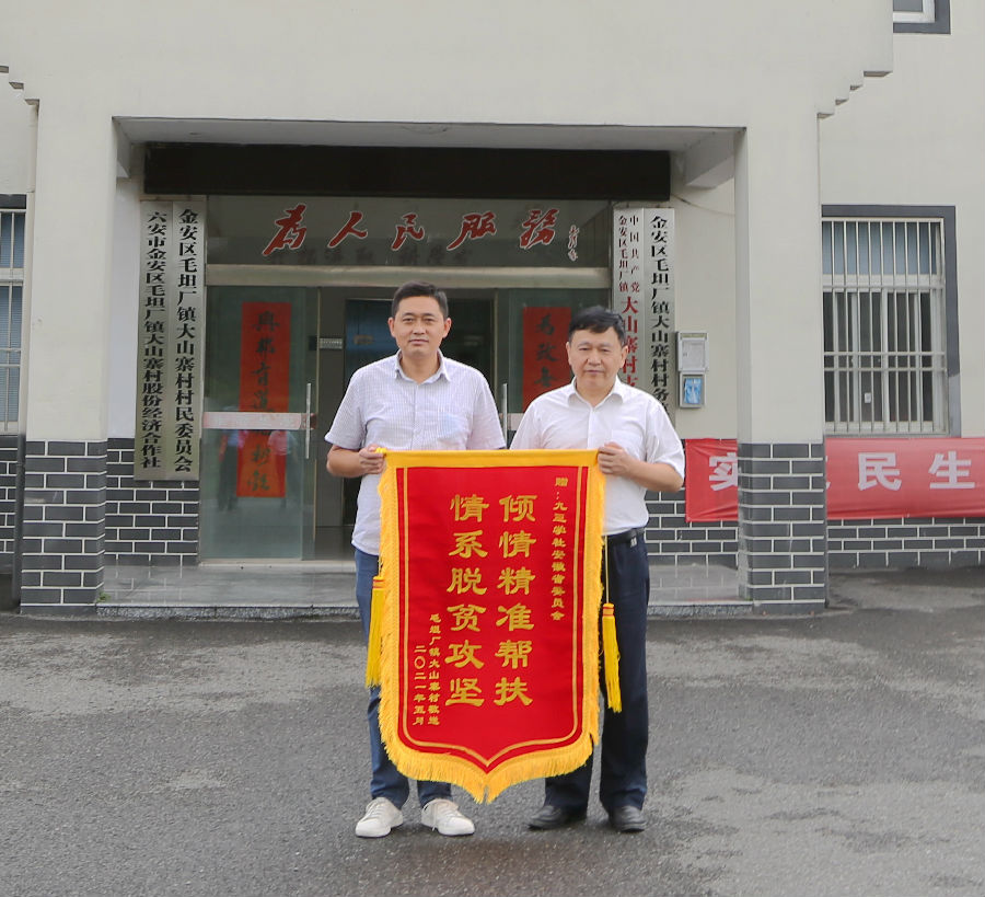 大山寨村委會書記胡曉松代表村委會向九三學(xué)社安徽省委贈送“情系脫貧攻堅,傾情精準(zhǔn)幫扶”的錦旗,感謝九三學(xué)社安徽省委自2015年以來對大山寨村的傾情幫扶。