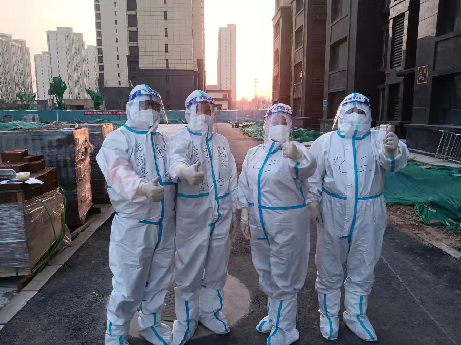 秦黃下隔離點屬于棚戶改造區,目前還是毛坯房,設施不完善,生活用品也嚴重短缺。隔離點內的127名隔離人員分散住在兩個高層里,王娜、許印登主要負責運送這里的生活物資和衛生清潔工作。這份工作重復卻不簡單,他們每天早上7點開工,經常要忙到晚上10點多,平均每天身著防護服的時間高達9小時。最初這里的志愿者團隊僅有四人,他們每天要把300件礦泉水從車上卸下搬到樓門口,從樓門口再搬到電梯上,然后才能挨家挨戶給業主送上去,每天累得腰酸背痛,晚上睡覺翻身都疼,但是第二天卻依舊充滿活力開始新一天的工作。