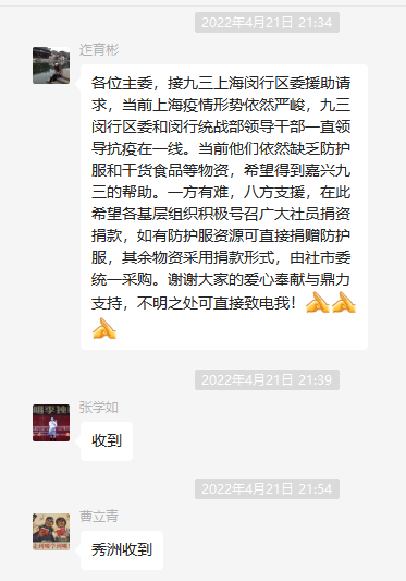 “各位主委,接九三學社上海閔行區委援助請求,當前上海疫情形勢依然嚴峻……他們急缺防護服和干貨食品等物資,希望得到九三學社嘉興組織的幫助”——4月21日晚,九三學社嘉興市委副主委迮育彬在微信群發出了一則緊急信息。