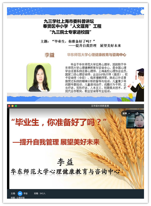 5月20日下午,九三學社上海市委科普講壇暨“九三院士專家進校園”再次“云”開講。這也是九三學社上海市委、九三學社奉賢區委、奉賢區教育局舉辦的“九三院士專家進校園”的第二次科普講座。華東師范大學心理健康教育與咨詢中心、國家二級心理咨詢師李益受邀為奉賢區實驗小學五年級畢業班同學作主題為《畢業生,你準備好了嗎?》的心理健康教育講座。