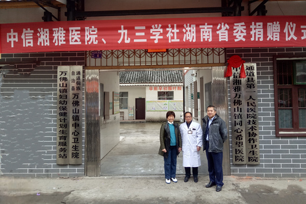 “很高興有機會面對面服務侗鄉人民”,這是2017年,湘雅名醫、省政協原副主席、九三學社湖南省委原主委、中信湘雅生殖與遺傳??漆t院院長盧光琇來到通道縣萬佛山鎮中心衛生院開展捐贈活動時的深情話語,詮釋了她的家國情懷。中信湘雅醫院與懷化很早就結緣了,分別為懷化通道縣萬佛山鎮、中方縣鐵坡鎮各捐助現金20萬元,并先后掛牌成立了“九三學社中信湘雅萬佛山鎮同心希望醫院”、“九三學社中信湘雅鐵坡鎮同心希望醫院”。