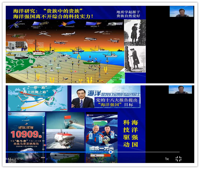 楊守業表示,中國在15世紀初曾擁有世界最高的海上技術,但從15世紀后期開始,優勢轉到了歐洲。幸運的是,中共十八大提出了“海洋強國”的建設目標,習近平總書記在2013年出訪期間提出建設21世紀海上絲綢之路這一戰略構想,極大推動了我國海洋科技的發展。從“奮斗者”號載人潛水器下潛馬里亞納海溝到智能機器魚海底遨游、從水下滑翔器研發到大洋鉆探船建造、從海洋實驗室規劃到海底立體觀測系統建設,楊守業對我國的海洋科技成就如數家珍,自豪溢于言表。他說,海洋強國離不開綜合科技實力與綜合國力的提升,中國海洋強國建設仍然任重道遠,需要全國上下同心同向、共同努力。