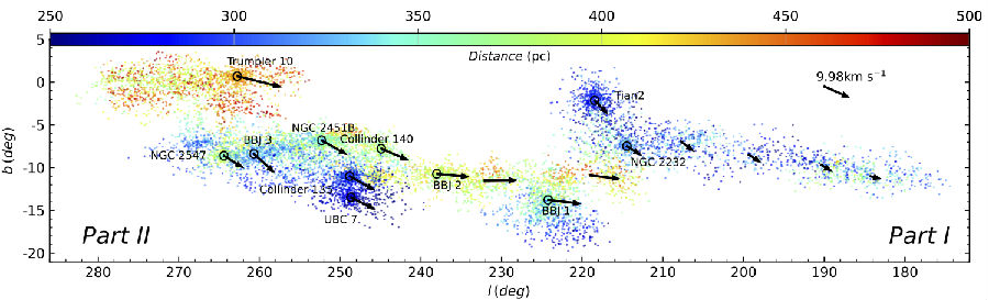 圖1. 恒星蛇在銀道坐標系中的整體結構,其中包括11個星團,顏色標示了成員星的距離,右邊的Part I為原恒星蛇的結構