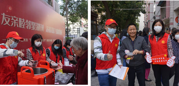 活動(dòng)現(xiàn)場(chǎng),志愿者們?yōu)榍皝?lái)參加活動(dòng)的市民送上一碗碗甜香四溢的拗九粥,借此傳遞孝道文化,寄托幸福安康的美好祝愿。